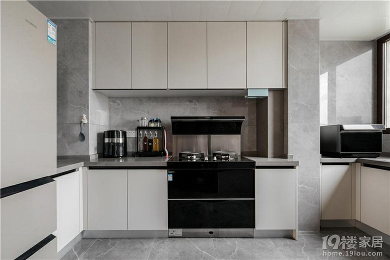 U型厨房,三面可利用空间,储纳厨房用品有了更多可能。洗涤区、烹饪区及储藏区划分明确,搭配多功能橱柜、餐具、调味品等抬手即得,让厨房不再是手忙脚乱的战场。