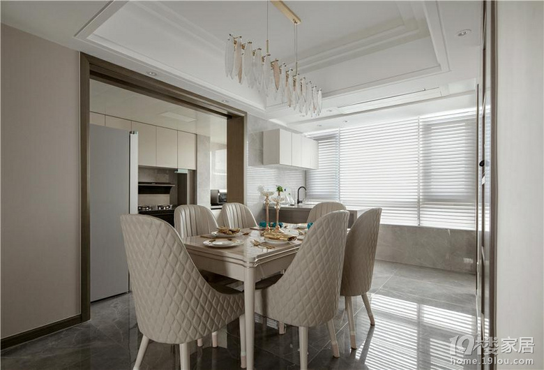 餐桌、餐椅的材质、风格与客厅的家具一致,色调的统一,简洁的造型让整个公共空间更加有格调。