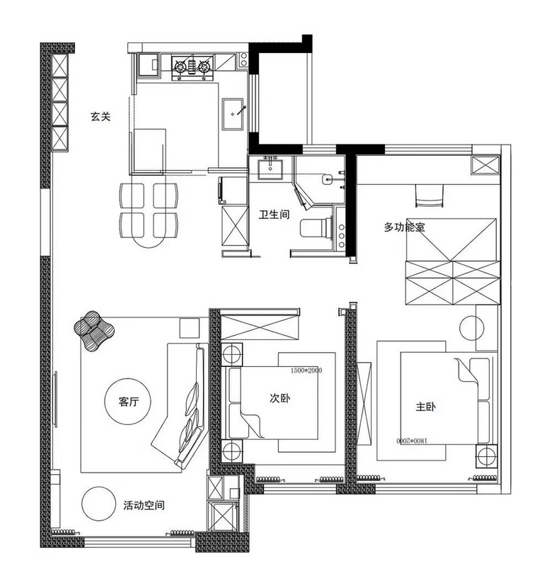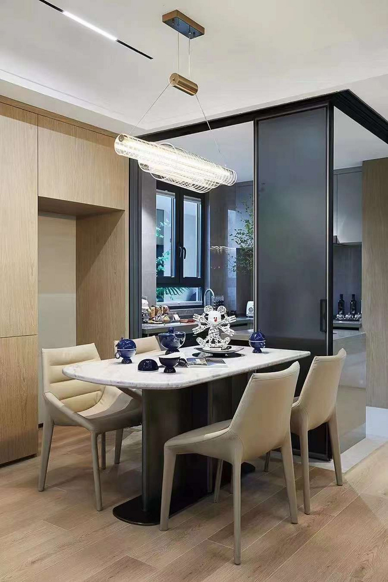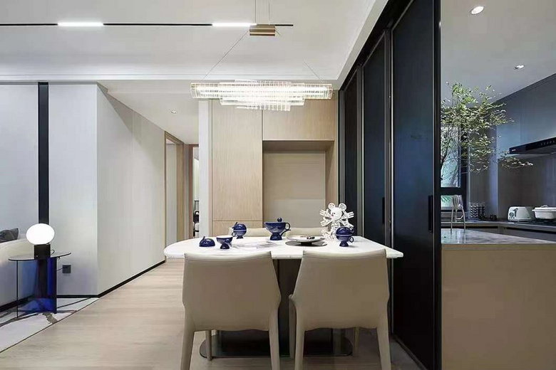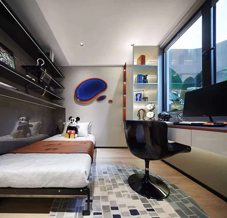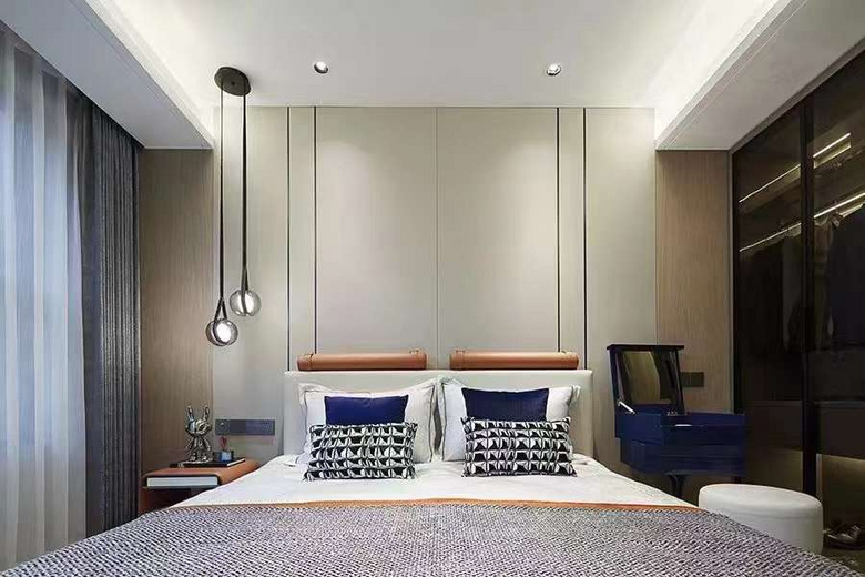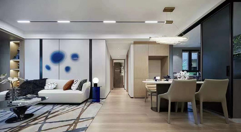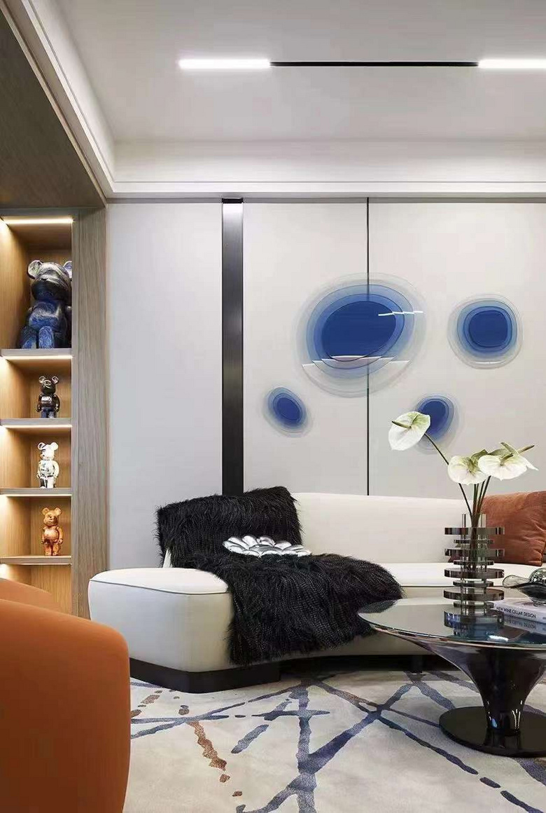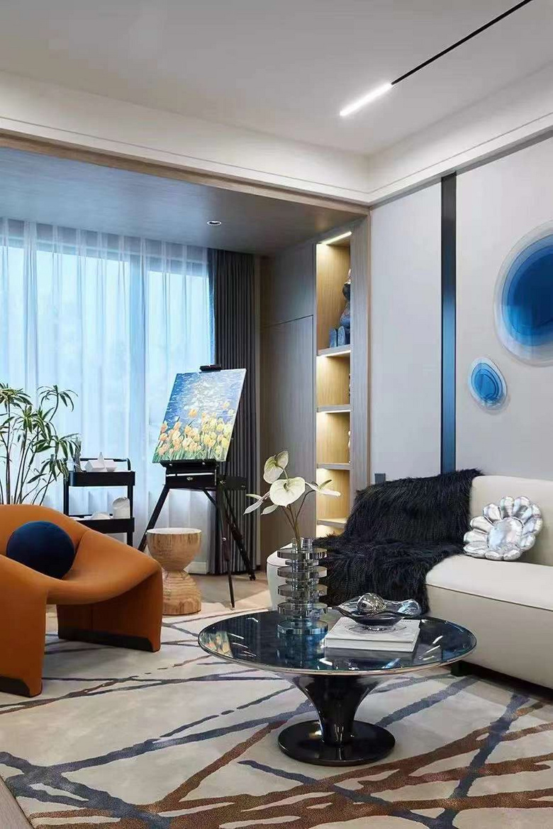 客厅在大色调上运用了驼色为基础色,深沉的湖水蓝和跳跃的荷兰橙点缀其中,为空间注入活力与温度。选用弧形的沙发和单椅、圆形的背景墙挂,为生活注入亲近可感的诗意。