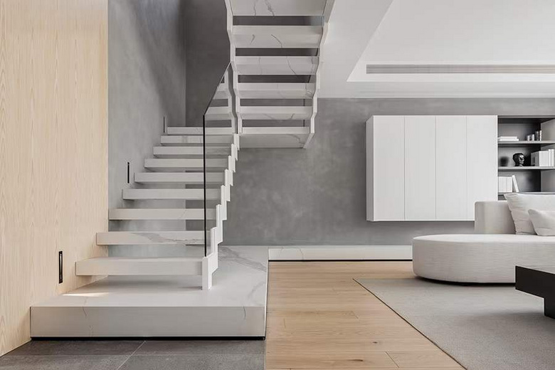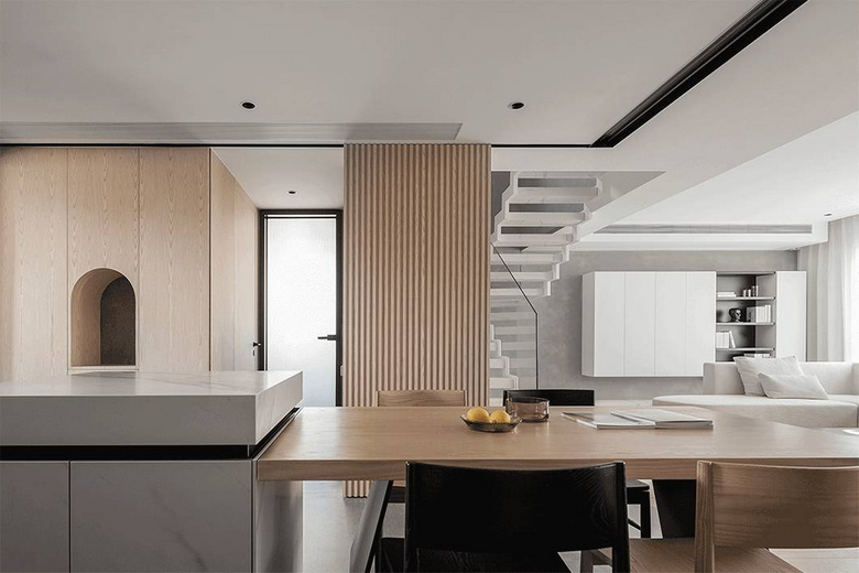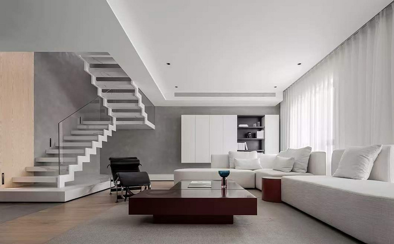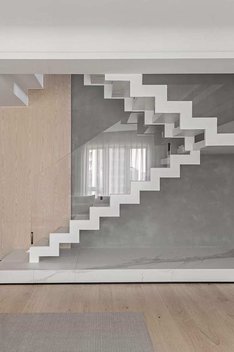 楼梯在空间中是特殊的存在,作为垂直交通的功能组件,亦是设计重心,突破循规蹈矩的秩序,阶梯半通透,视觉上得到舒展,轻盈通透,打破了空间的沉重压抑。