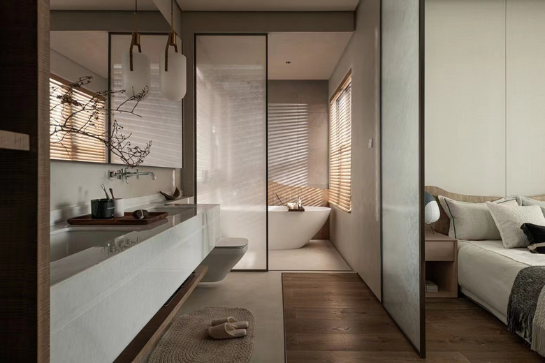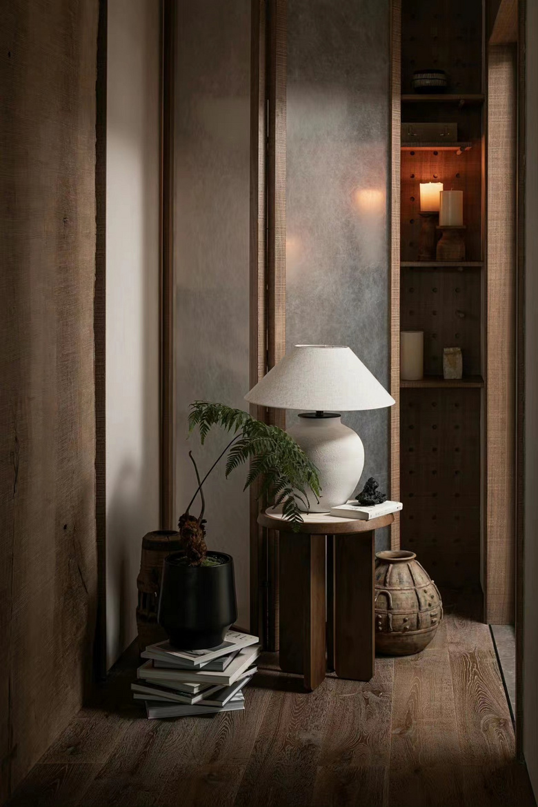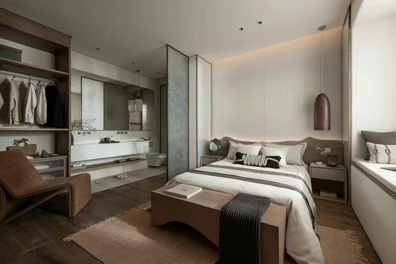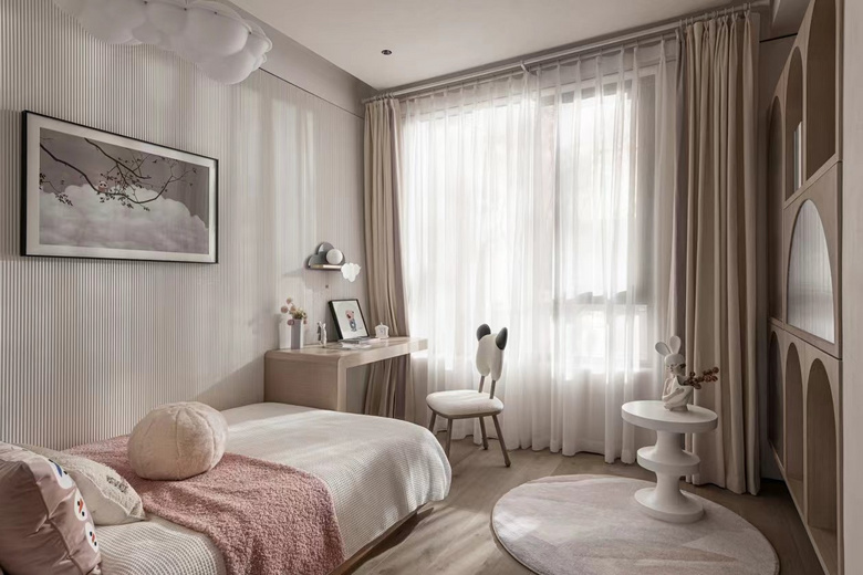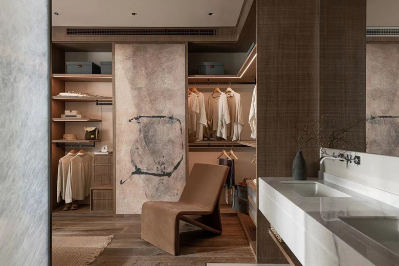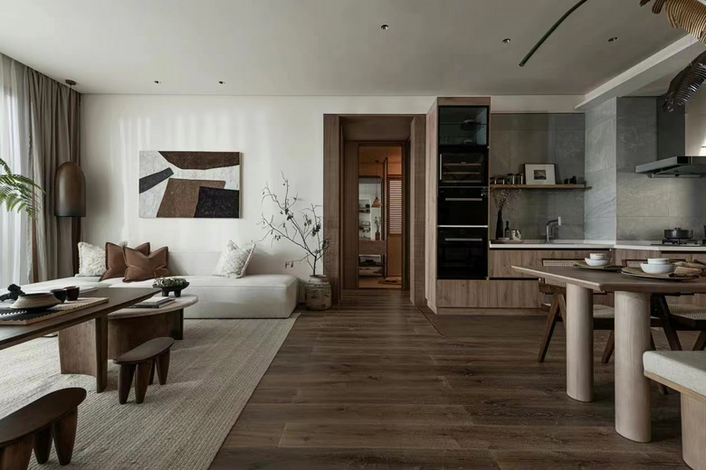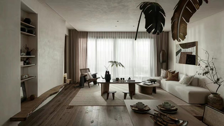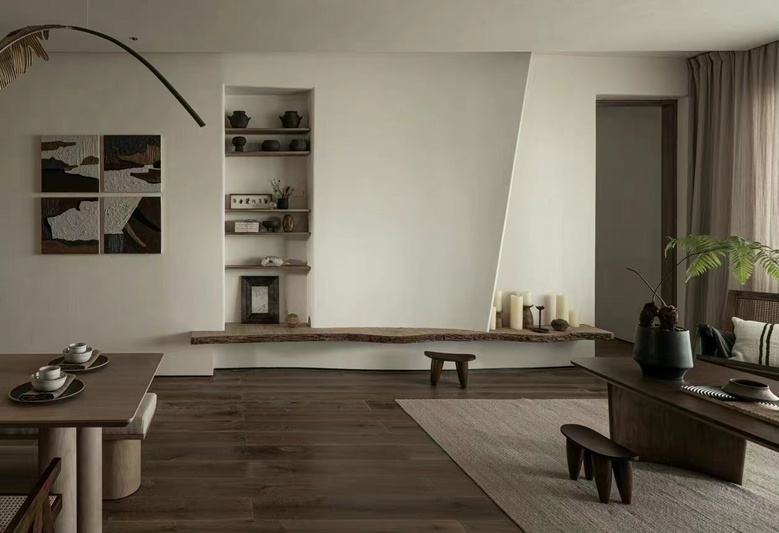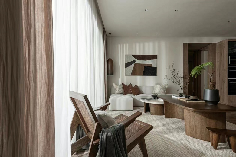 侘寂不是孤寂,而是安然。微水泥涂料与原木的搭配,让房屋回归本真,清冷却温柔。曲线墙面设计乃空间灵动的一笔,打破常规“横平竖直”,赋予空间更多视觉感受。
