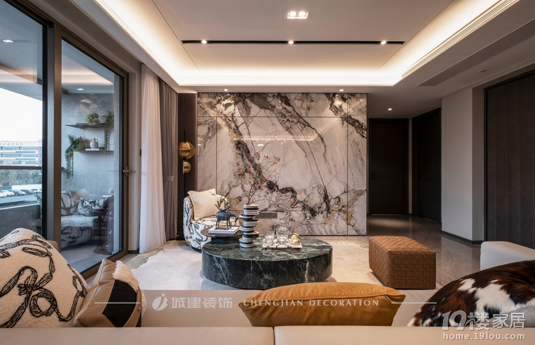 横厅的格局,空间秩序井然、互动自在紧密;皮沙发的温润,碰撞大理石背景墙的奢华,品质格调一览无遗;布艺沙发椅与地毯的加入,让空间既具轻奢气质又不失温度。