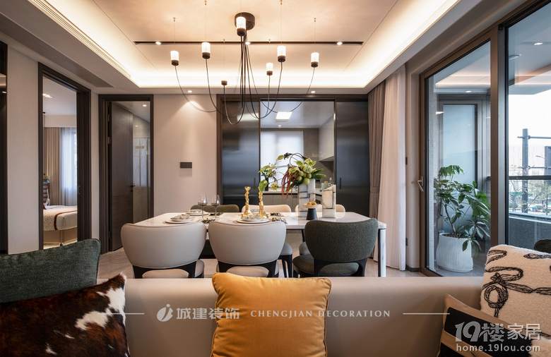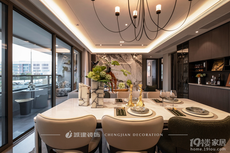 白色大理石西餐桌让菜肴更清晰的呈现,设计感十足的吊灯让就餐空间时尚感与氛围感并存;深咖色柜门与黑玻柜门搭配的餐边柜加入金属线条,从细节体现空间的高级质感。