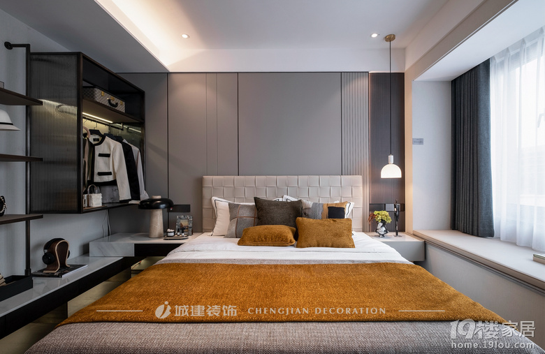 主卧,有层次的灰色硬包背景墙搭配浅色床具,温馨时尚;开放式悬挂衣帽置物架非常有设计感,床尾挂墙式梳妆台不占用空间,整个空间非常轻奢小资。