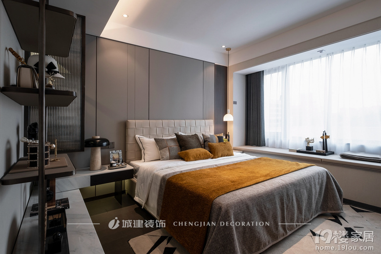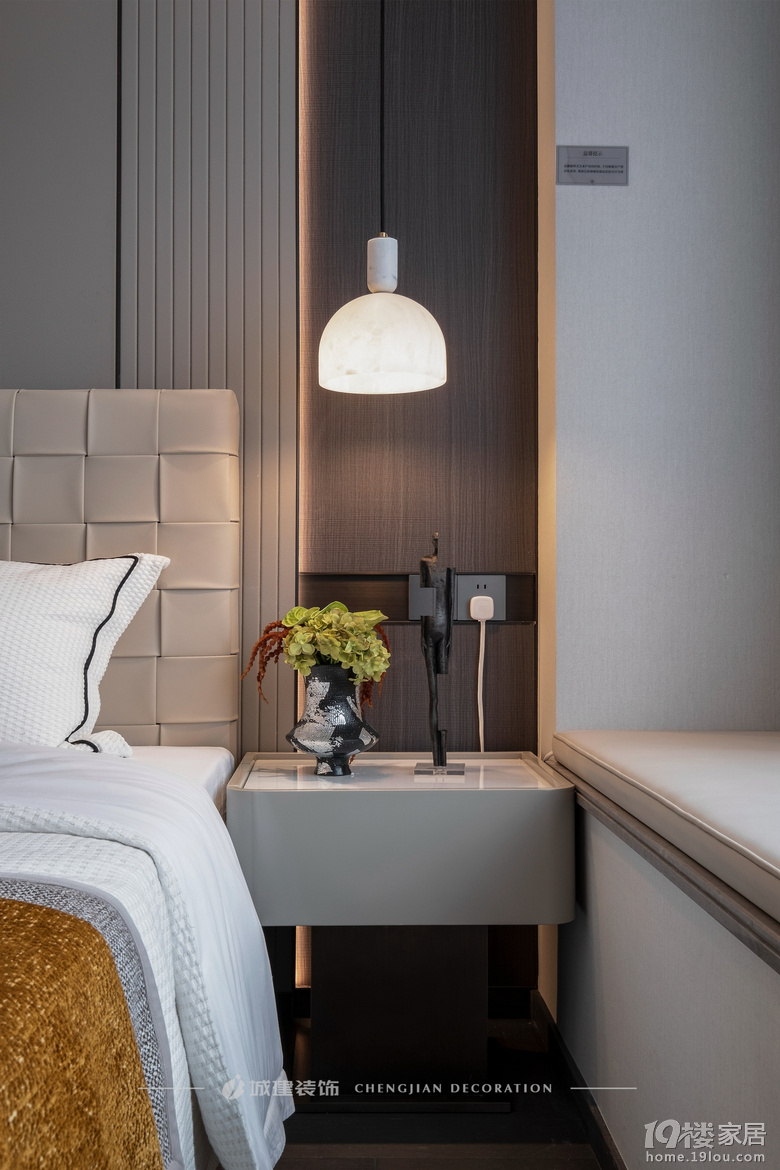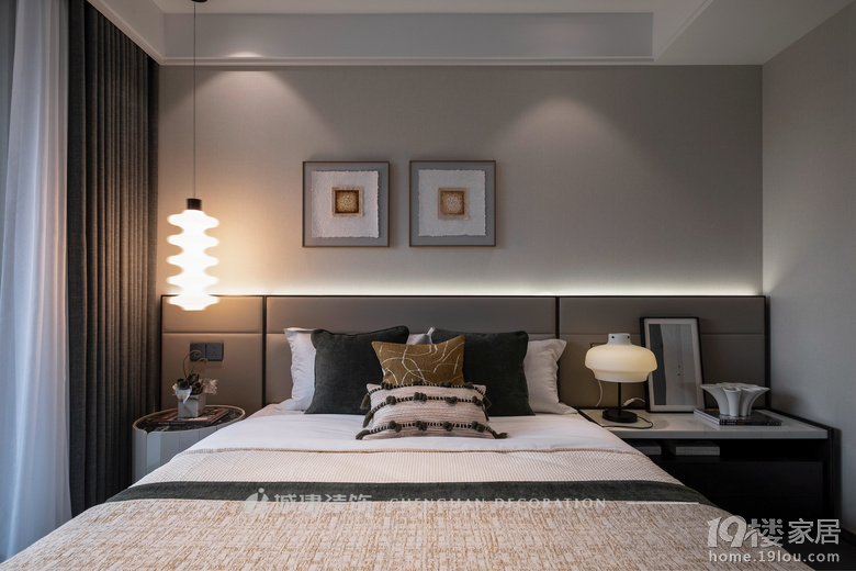 客卧,定制床头靠背,内嵌灯带,更有整体感与层次感;整个空间由灰色深浅搭配,搭配艺术装饰画与吊灯,氛围雅致静谧。