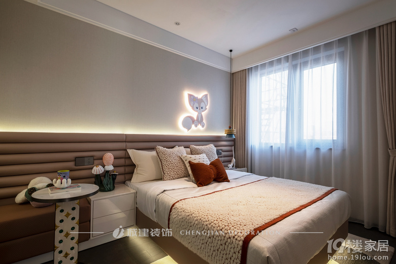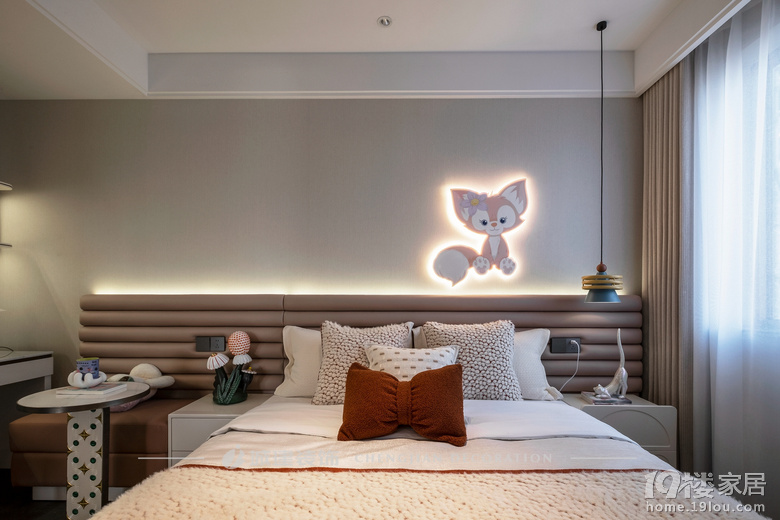 儿童房,墙上有女儿喜爱的玲娜贝儿,由此延伸定制粉色的软包床头靠背,让可爱蔓延整个空间;童趣吊灯+隐藏式灯带,无主灯设计使空间光线更柔和。