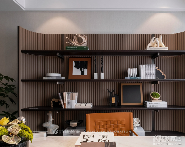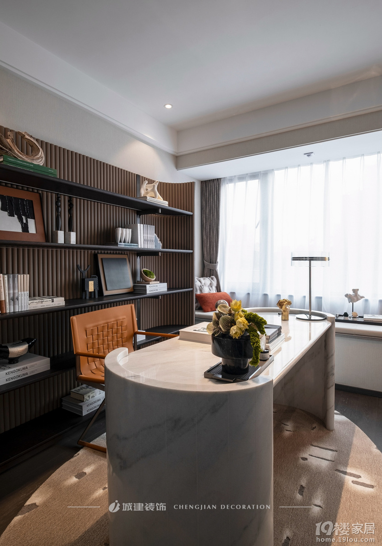 书架造型如展开的书简,书香气韵浓厚,弧形让空间更有氛围感;书桌同样以弧形元素与其呼应,大理石材质的硬朗与书架的温润,让空间氛围克制但很温馨。