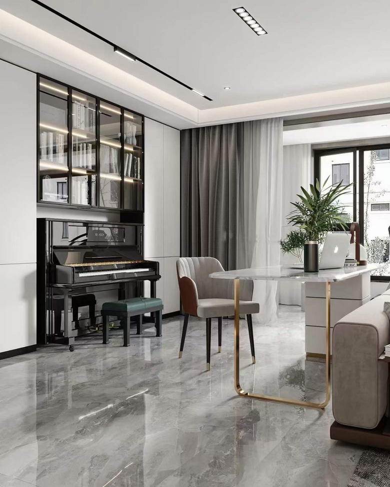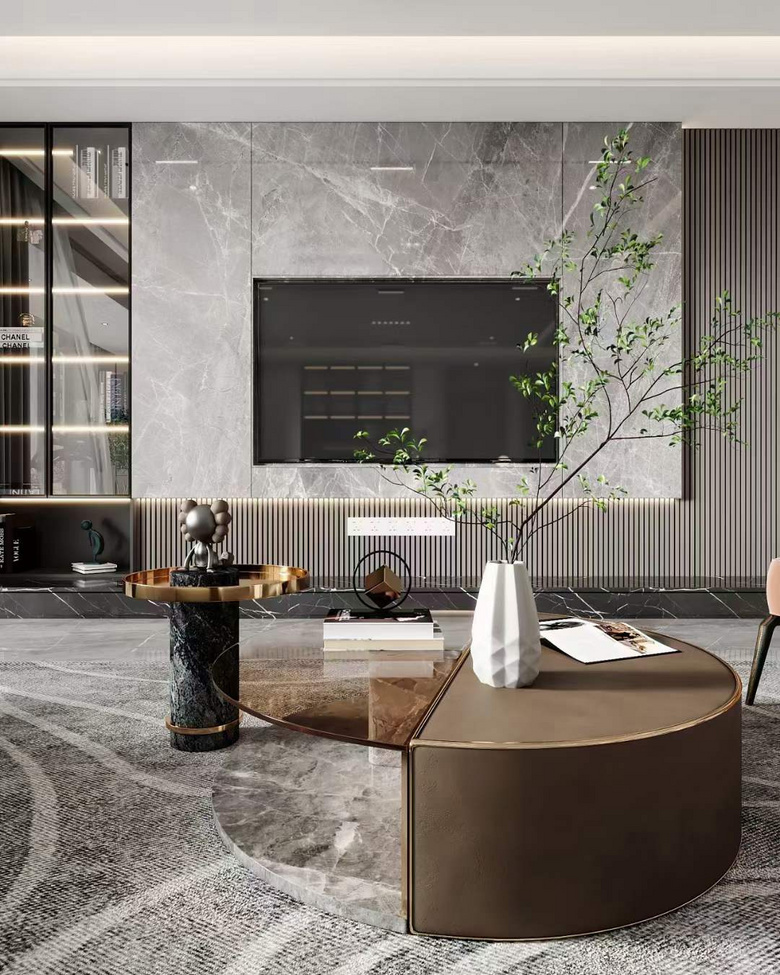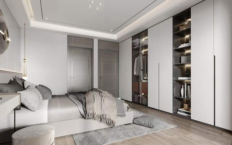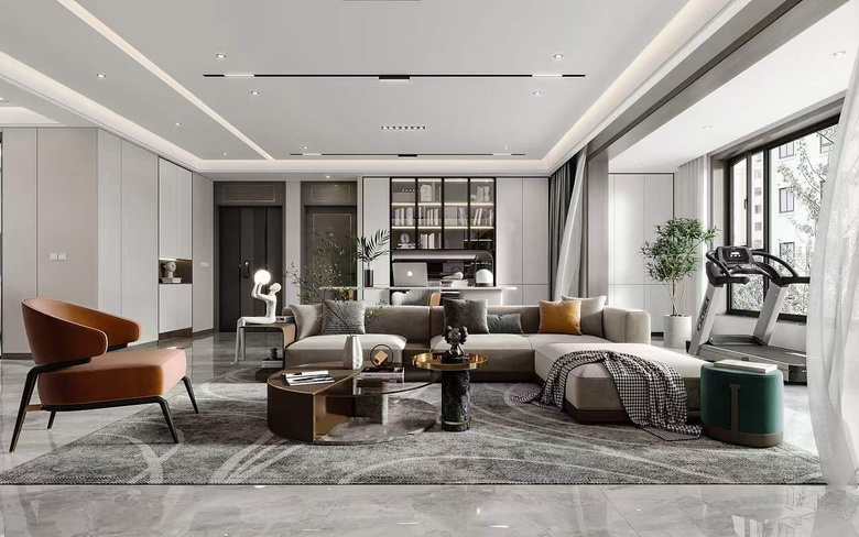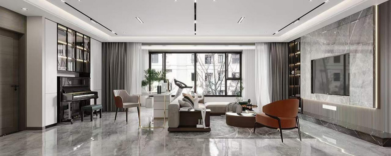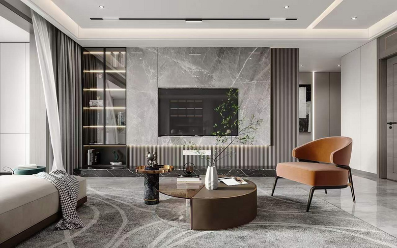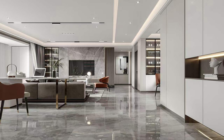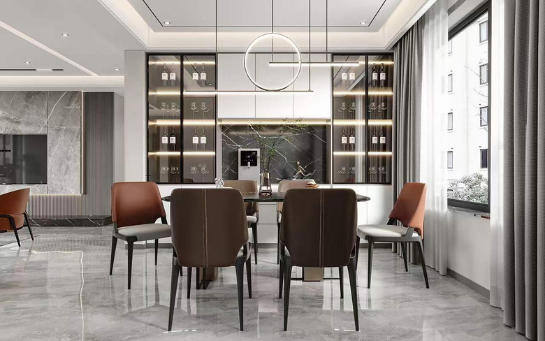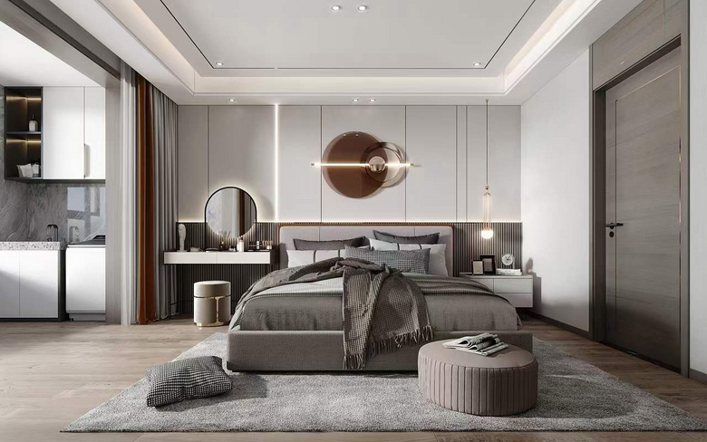 以现代黑白灰作为色彩基调,低调的木质元素、哑光地砖、柔软皮革递减冷感,丰富空间质感。