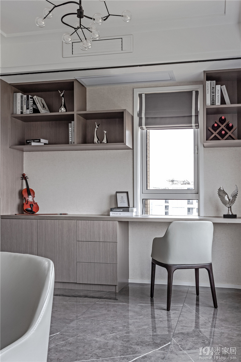 书房沙发背后就是书房,中间用白色吧台拦截,用来连接书房与客厅,打造隔而不断的空间布局,书房内色调淡雅自然,书桌与书柜做一体化设计,底部部分腾空,用来放椅子,整个空间不显繁琐、明亮通透。