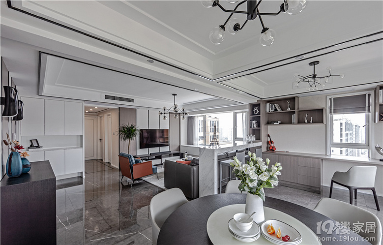 客厅客厅以白色和灰色为基调,穿插着黑色,统一中又富有变化。水灰色石纹地砖铺就,搭配留白墙面,通透的