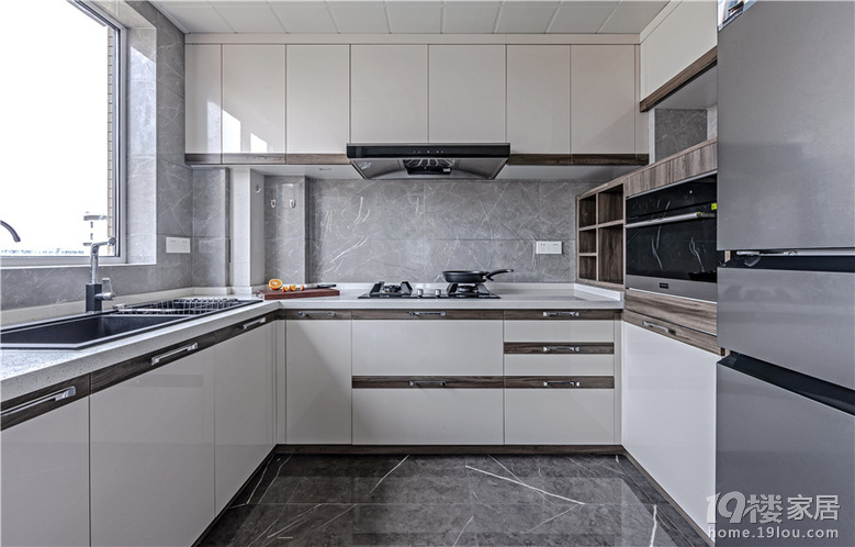 U型操作台面布置最大化利用空间,白色橱柜搭配灰色墙砖,层次分明。油烟机、冰箱等电器也全部嵌入柜体,视觉上简约舒适,功能上也十分齐全