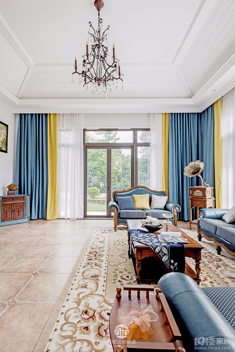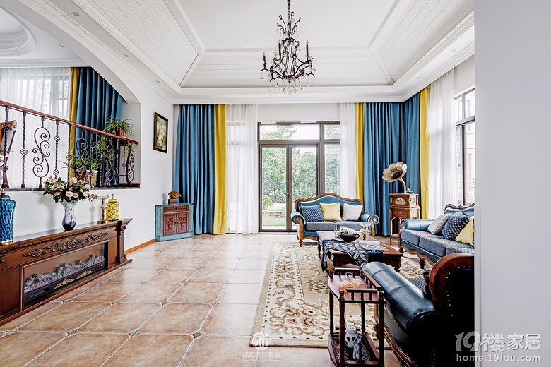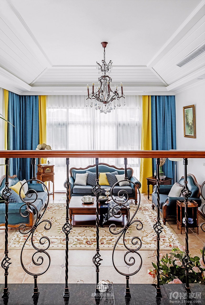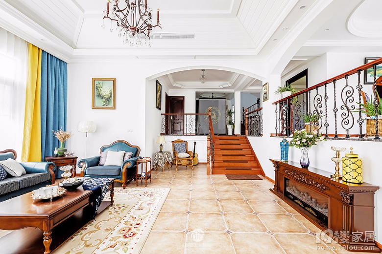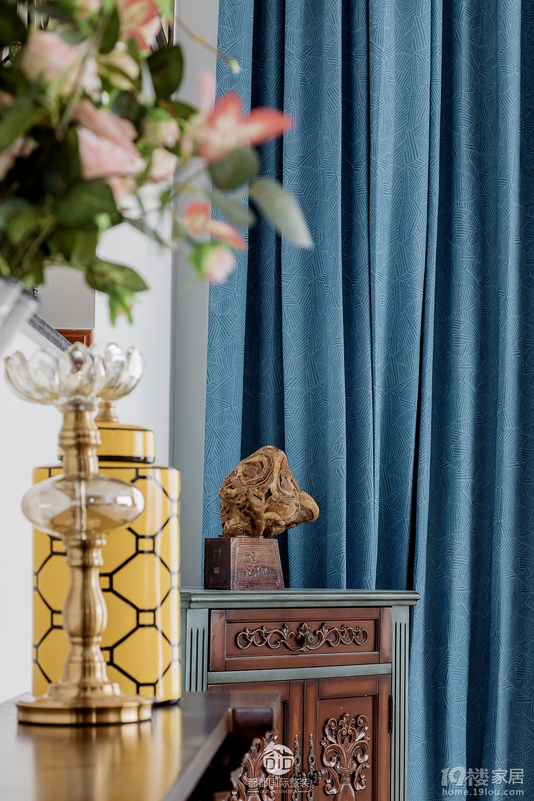 初见,最大限度地优化建筑平面,室内空间阔绰从容,并以优雅弧线贯穿室内,构建流畅动线,围合着得宜的空间尺度。全屋木饰质感细腻,蓝黄色窗帘做为起承转合的色调奢华却不张扬。