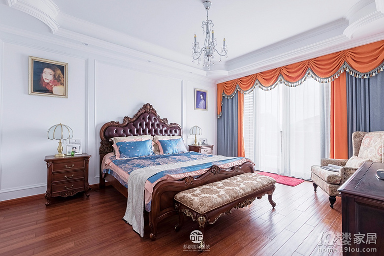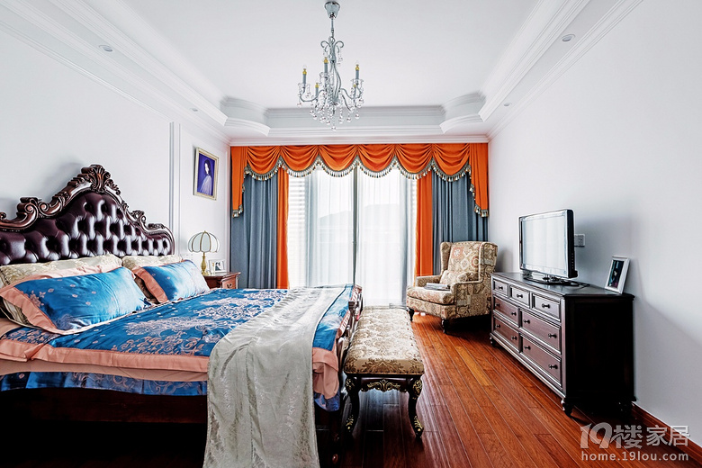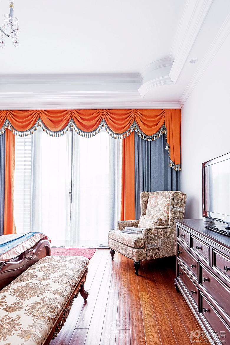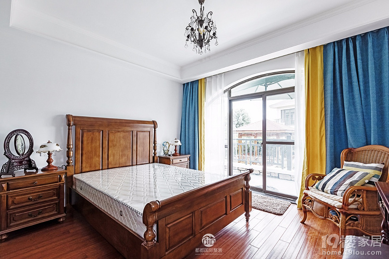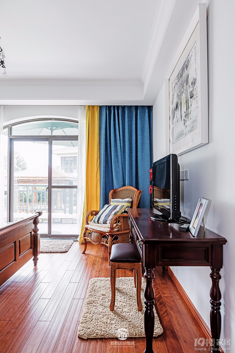 卧室空间承接着煦和的自然光线,蓝色橙色的窗帘搭配木质储物柜显出独特的雍容气质,微风穿堂,近在咫尺的诗与远方。