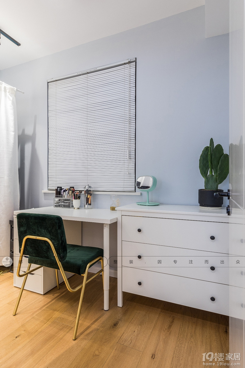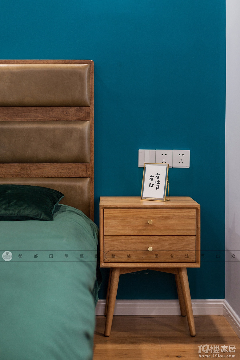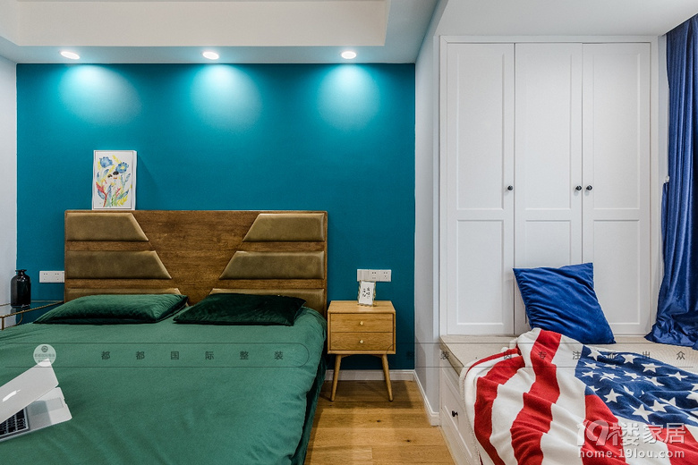 寝卧,选用了蓝绿色作为主墙色彩,与亮眼的飘窗窗帘相映成趣,搭配略带复古的家具柜体,木质储物柜。
