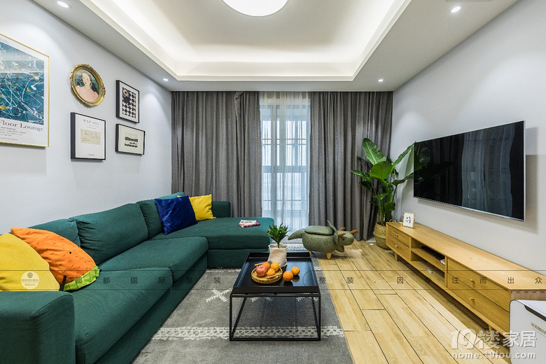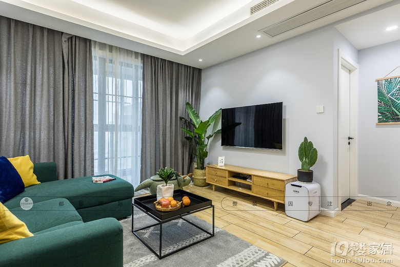 客厅的深绿色与亮黄色、黑色与原木色调相撞,简约茶几舒适大方。点缀的绿植与整体色彩相呼应。