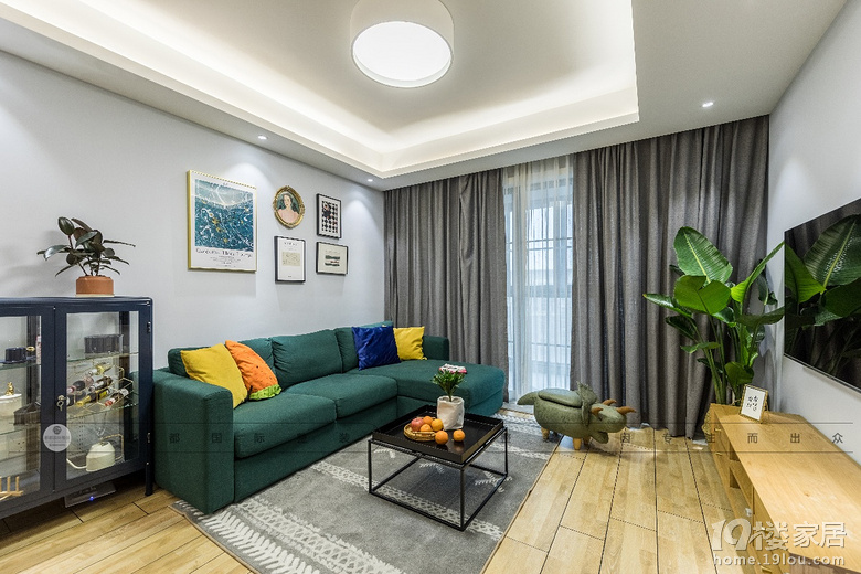 本案空间小巧精致,亮眼不失沉稳的深绿色沙发,亮黄色的抱枕,复古与简约壁画来回贯穿,形成舒适的视觉效果。木质地板,几何撞色的毛绒地毯,玻璃黑框储物柜,黑色茶几,健硕生长的绿植构成了家的第一印象