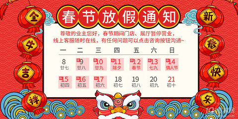 为使公司各项工作在春节期间也能正常有序的开展,2016年春假按不同岗位工作需要具体安排如下: 工程项目部2016年2月1日——2016年2月22日,2月23日(正月十六)上班; 其他部门(质检/设计/行政/财务/商贸/客服/企划) 2016年2月1日——2016年2月14日,2月15日(正月初八)上班; 总部值班客服2016年2月5日——2016年2月12日,2月13日(正月初六)上班;一年一度的