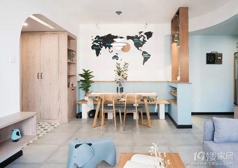【小区】:富力西溪悦居 【户型】:2室1厅 【面积】:78 【风格】:北欧 【施工】:江水平装饰 平面布置图 入户玄关走廊和餐厅之间做了一个半墙隔断,上方做造型,下方也留空部分来摆放绿植和加上藏光,玄关的侧方是摆放了换鞋凳,方便日常使用。 餐厅处的空间不算很宽敞,更多的面积留给了收纳,餐厅的背景墙上做了地图装饰,原木风的餐桌椅搭配绿植显得自然而又清新。 整个客餐厅的颜色是以白色与浅蓝色为主,地面铺
