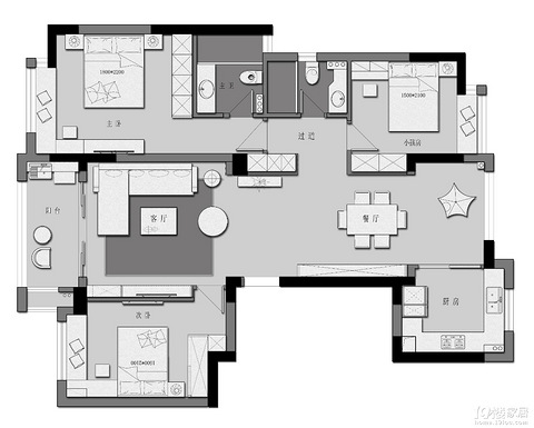 跟林工是在19楼的家装展认识的,相谈甚欢,他的设计想法都非常棒,我们当场就加了微信发了户型图给他,还约了下次看设计图的时间,整套房子装修下来给我唯一的感觉就是轻松,全程都是设计师和项目经理忙前忙后,我们只需要动动嘴皮子,最后验房的时候更是出乎我们意料地好。◆ 设计亮点:四房改三房,开放式书房空间,现代简约风格,主色调浅灰色,黑色深灰点缀,整体较为耐看,同时圆弧元素加入,提升整体视觉焦点。◆ 房屋信