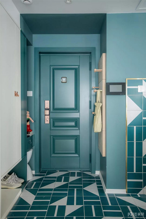 这套建筑面积93平米,实用面积75平米的现代风格三居室,色彩搭配以蓝色为主,绿色为辅,再通过一些基础和鲜艳的色调点缀,整体给人一种非常时尚高级的感觉。玄 关 ▲ 入户玄关的功能与大多数家居一样,一侧是鞋柜,一侧是挂衣墙,唯一让人惊艳的是色彩搭配,以青蓝色为主,白色为辅,几何拼接的铺贴方式,看起来非常时尚独特。厨 房 ▲ 厨房与玄关靠着,所以在配色上也与玄关差不多,以保证整体和谐美感。开放式的布局,