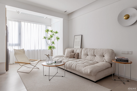 装修完也有一段时间了,89平的小窝,面积不大胜在温馨,当时找到设计师的时候就跟他说我喜欢家是暖暖的感觉,所以整个房子都透露着“温度”感,我的家希望你也喜欢~ 地址:水榭春天 风格:原木极简 面积:89㎡客厅 整体客厅色调以暖白色为主,青绿色点缀,释放更多自然温润感,配上柔软舒适的浅色沙发,让整体简约的空间增添了一份时尚轻奢感 背景墙做了简单的白墙设计,用装饰画、墙饰和绿植作点缀,丰富墙面的层次感。