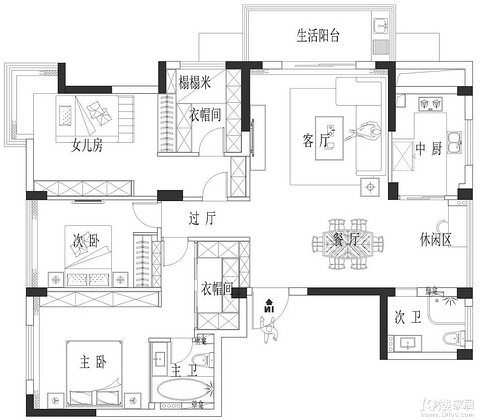 ▼▼杭州·美哉美城▼▼户型:4室2厅1厨2卫▼▼风格:美式▼▼设计师:首席设计李杉 一层平面图 二层平面图 一楼以功能性空间为主,除此之外,考虑到父母年纪大了,将老人房也设计在了一楼,二楼则是主卧和儿童房空间。下面我们来看看装修这个磨人的小妖精在美女设计师和精明业主手里如何服服帖帖。 业主需求一:尽量不改变原始结构 原户型比较方正,客餐厅保留了原来开放式的通透,整扇的落地窗最大程度地增强采光