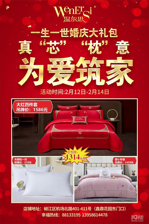 只要你敢想我就敢送 【温尔思家纺椒江旗舰店】情人节专场为你而来 预存一万元即送价值4386元蚕丝被,消费没时间限制,心跳不?(限时限量 先到先得) 结婚嫁娶、乔迁新居的亲们不容错过哦~
