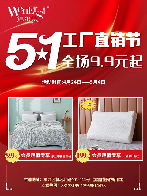 来了 来了 它来了【到厂家 买厂价】 温尔思家纺椒江旗舰店 5.1号工厂直销节,全场9.9元起!冲刺五一,你放假我放价,一年仅一次,莫失良机!乔迁新居、嫁娶、置新、团购送礼过来看,绝对的超值!4.24-5.4号,多重惊爆福利,就等您来!姐妹们,不见不散~