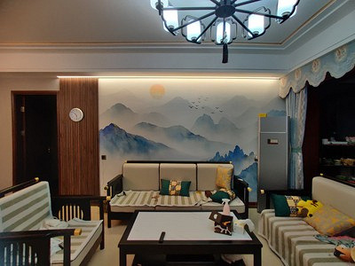 装修的新中式风格,家里的沙发和座椅、茶几、电视柜、餐桌,都是一个系列的,颜色稍微稍微有点深,适合家里新中式风格。是爸妈跟着邻居去的北岸那边一个专门买家具的地方买的,全部下来一万五吧,东西挺多,其实也还可以。