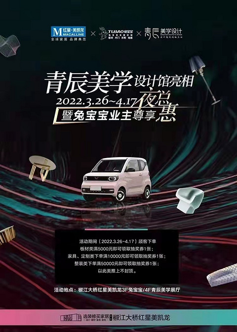#椒江大桥红星美凯龙#2022.3.26-4.17 青辰美学设计馆亮相兔宝宝业主尊享夜总惠宏光MINI万元首付款任性抽