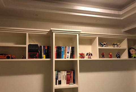 衣柜是木工做的,配合整体白色装修风格,衣柜门是买的现成,选择米色系,上部分为条纹状,中间设计一个凹造型门把手,用起来方便。而最上方的一排柜子必须是老妈用来放四件套,棉被枕芯的,装了黑色把手。次卧大差不多的设计,衣柜门换成全白色,竖向条状,中间斜线全白,一样的隐藏式门把手。再来看我的书房间,完全是橱柜里整了一个床,从空间利用上来说,打造一些墙面储物柜增加储蓄空间是很有必要的,而这就需要木工师傅量好尺
