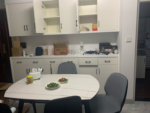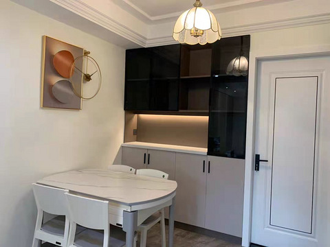 厨房的采光不好,就把厨房和餐厅的墙拆了,用木工板隔开,中间放一块大玻璃,这个设计还是很满意的,厨房采光变好很多,餐桌选的哑光纯白岩板,框架是铝合金材质,整体还是挺不错的,很好打理,餐椅本来考虑到坐感选的有坐包偏现代一点的,后来感觉整体搭配不好,最后买的是塑料材质的贝壳椅,坐感还可以,实物质感也可~配了两把彩色的,提升温馨感。