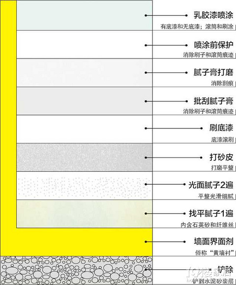 油漆是是家里装修的最后的表面工程,需要注意防开裂,注意平整度等等,小分享 铲墙1、在砌墙前墙面顶面铲除干 净2、刮腻子前先滚涂界面剂3、腻子应满足施工要求,腻 子与基体结合应坚实、牢固、 不粉化、无裂纹;找平腻子将 顶、墙基础刮直、刮平后,开 始安装石膏线,再刮光面腻子石膏线1、阳角要用找平腻子做直2、墙顶面找平后再安装石膏线,以免石膏线不顺直3、安装石膏线后再刮光面腻子以防脱落点锈处理对石膏板吊