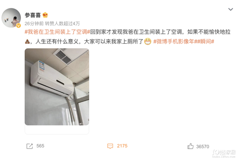夏天没装空调的卫生间,到底是谁在呆啊! 最近厕所卷纸的消耗量巨大,上完大号感觉是从水里捞出来,蹲坑10张纸,九张擦汗一张擦粑,这几年唯一一次生病,就是在家里厕所中暑,当场三分熟,真的是受不了了! 前段时间,看到热搜有人在卫生间装空调,而且还是挂机,打个孔就能直接用的那种,我就和老婆申请经费,想在卫生间里装个空调, 我看热搜下面基本上都在支持卫生间装空调,毕竟代价又不大,现在变频空调2000多都能