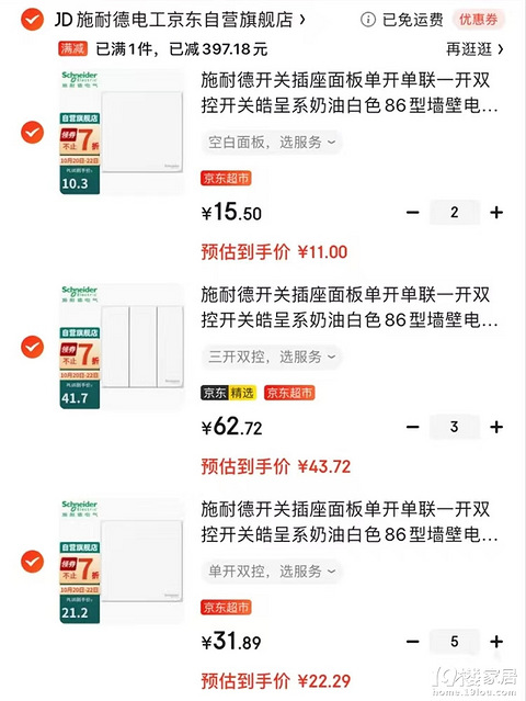 来咯!来咯!一年一度的坑钱大会又要来了。 今年618就的预售5月24号晚8点就开始了,我身边好多小伙伴都开始摩拳擦掌,但是经过去年的折腾,我真的毫无波澜。 去年由于新家的装修进度,预计在6月左右开始买家电家具等,因此很多家电家具都提前看好了,会时不时关注活动价格,但这次某东的618可真让我见识到了什么叫明着说优惠,其实都在涨价,购物车里最夸张的就是今天要吐槽的施耐德皓呈系列插座面板。 ▲活动前的价