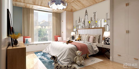 虽然是美式风格不过这里走的是清新路线,全屋以蓝色背景墙为主,搭配白色柜子、浅色家具,整个营造出的是一种自然清爽、舒适自在的环境与氛围。