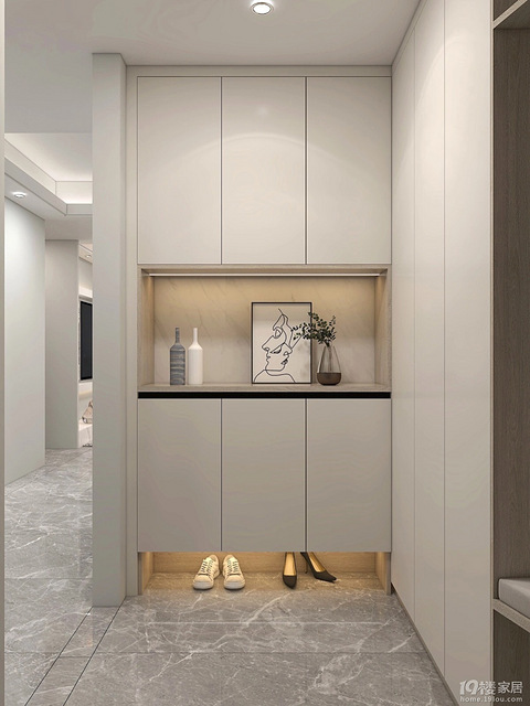 一家三口,仅做一个顶天立地换鞋柜就够了吗?单纯用来放鞋子是够的,但要再加上常穿衣物、常用包包、各种帽子、装饰品,恐怕就不够了。人口多的家庭,不妨将入户玄关抬高10公分,前半部分是鞋柜、后半部分用作衣柜,台面用做储物,底部采取悬空设计,鞋柜内加装活动隔板,方便收纳各类鞋子。