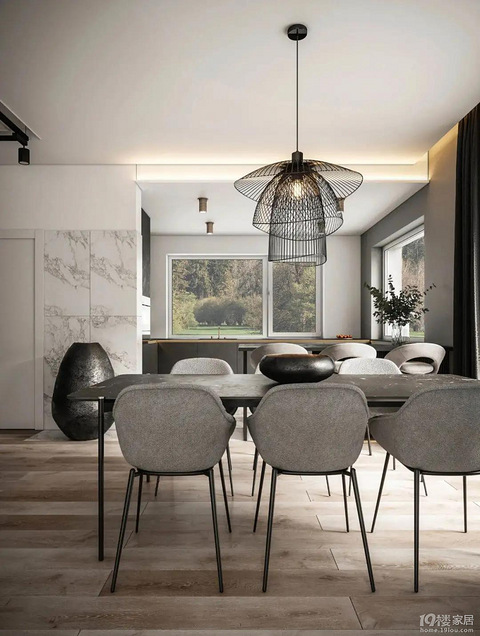 140m?简约典雅,生活的灵魂! 这是一个140㎡的静谧生活空间,颇有采菊东篱下,悠然见南山的诗意感。设计师为用户打造了一种深居简出的舒适环境,呈现了一个简约而不平凡的空间。 一入门便是一眼望穿的客厅,全落地的透明玻璃窗将室外的景色大面积的引入室内,形成内外一体的自然空间,拓宽了视野。客厅的基调整体为灰白色,现代的大理石和灯具、软装,让空间的时尚感充实而丰富。 开放式的厨房用大面积的黑色堆积,稳重