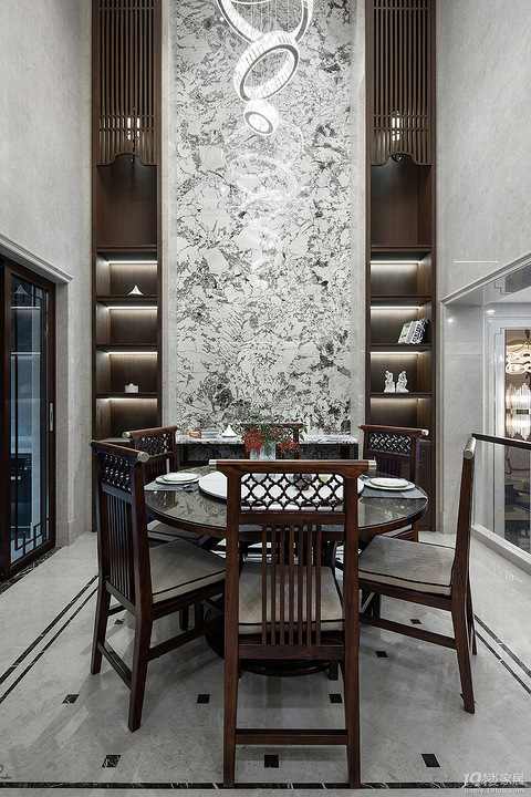 1.新中式原木圆桌圆桌在东方人心中拥有更多情感上的牵绊,古韵十足的实木餐桌搭配高靠背雕花实木餐椅为空间聚气,平和而温馨,过节的时候一家人欢聚一堂,幸福感萦绕其中。 大理石花纹背景墙的两侧定制了两排内嵌灯带的展示柜,放上古香古色的装饰品,创造出一个不脱离传统的用餐之境。 2.大理石岩板餐桌餐厅橘色、浅咖、素白、黑色灵活运用,大面积铺设大理石,整个空间更具延伸与通透感,圆圈元素的灯饰俏皮趣,搭配几束清