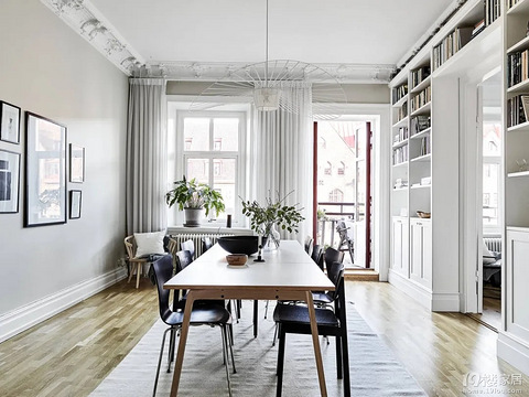 餐厅和卧室之间装有嵌入式书架,延伸到整个墙壁和天花板,增添了壮观的效果。 每个书架模块下面都有一个带有门的封闭式储物区,与上面的开放式书架配对,展示了一系列的书籍、配件和存储盒。 两个房间的内部色调是黑白相间,结合了木质家具的自然色调。书架上的小橡树幼苗为书架增添了一些绿色。#一人一个装修经验