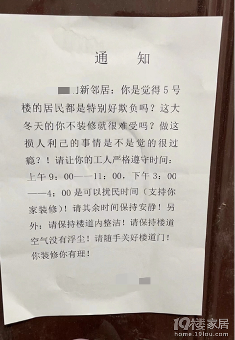 装修之前挨家挨户送了小礼物,也去社区报备了要装修,交了保证金,只有工作日的工作时段会动工。 今天工人就给我发了照片,有邻居在们上贴了纸条,要求每天只能装修3小时,空气中不能有浮尘,工人说最近几天上工还会有人拦着他们不让上楼,说是家里老人心脏不好不能太吵。 所以我买了房子只能放着吗?之前送礼物的时候,六楼说自己装修装了快两年,我还以为是夸张了,现在怕是要步他后尘了