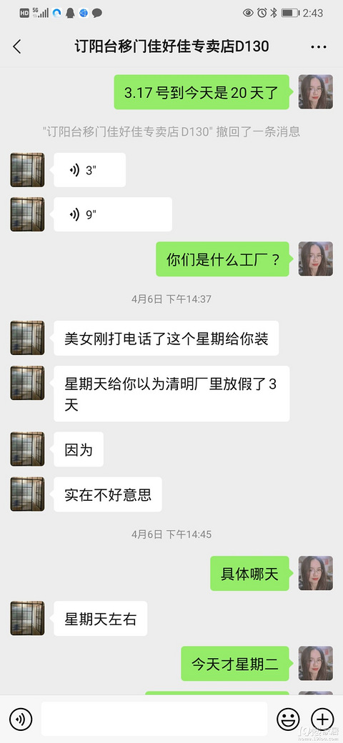 我3.17号在秋涛路佳好佳博名移门定了阳台移门,说好工期10天来装,结果等到4.6号一直没来,后来去问了,说周末来装,也就是4.11号,于是我在4.10号又提醒他是不是明天来装门,结果催了一天都是厂里联系不上!联系不上厂家!!我催到晚上也没得到答复,直到第二天说厂里工人出事了!要周二来装,也就是4.13号!4.13号来装了,但是锁没有,又不能后加锁,只能拉回去改!这一等又是十多天过去了,重新做也做