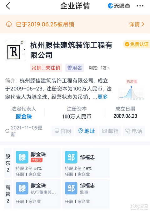 月星家居市场一楼A076的滕金珠,邹福忠不遵守合同约定等工期一拖再拖,2021年9月签的合同承诺45天,到2022年3月15日都还没有完成。期间经过市场监督管理局多次协调任然不遵守约定时间。希望大家擦亮眼睛,不要被无良商家坑到,本人已经决定走法律途径维护自身权益。打算把自己的维权经过,包括诉讼经过,记录在本帖子。2022年3月24日,通过天眼查发现,滕金珠,邹福忠二人2009年注册的杭州滕佳建筑装