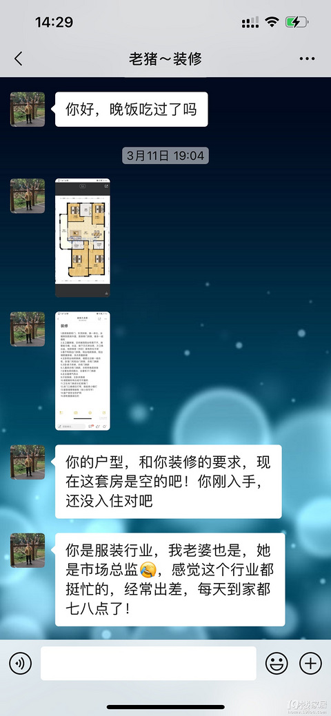 发布了个二手房翻新之后陆续很多的装修师傅及装修公司找来要看房报价。二手房改造翻新考虑我们局部改造,参考了装修公司人的意见,打算找个好手艺的包工头来做。陆续约了二三个师傅上门,报出来价格2w多到6w多不等,当时因为上个房东东西没搬完也没法准确定下来,事情就耽误了十几天。3月11号时有个自称是在铭品装饰上班的郑x镇人发信息说看到我这个小区有帮别的楼幢装过,讲话讲过来很有道理就加了微信有了以下的沟通。过