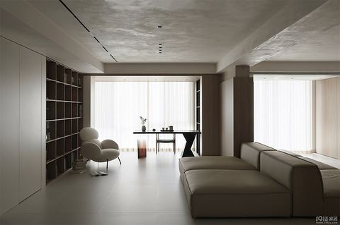 设计师在设计的过程中,我们剥离掉了西方过于抽象的艺术风格和大行其道的流行的拘囿,尝试将居住对象的随性主张以及自我认同融入到空间的精神塑造中,去呈现独属他们的丰盛生活与广阔世界。 客厅,硬装的部分极力摆脱造型,而是通过块面和线条塑造更具包容性的空间。软装以大地色系为主,柔和的色彩过渡搭配哑光的金属、温和的木饰面、柔光的地砖,让空间的整体感观更为内敛和谐。 于此,我们希望通过并不张牙舞爪的方式去展现空