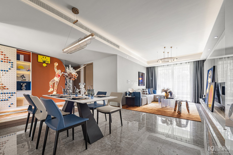 潮流是一种生活态度,不仅仅体现在穿着搭配,更源于我们对生活的看法。设计师将空间设计赋予“潮玩”的主题,以新生代潮流派的生活理想为契机,打造年轻人喜好的i+社交活动场所,找寻童年记忆中那一段弥足珍贵的回忆。 客厅的整体调性偏个性活泼,运用亮橙色、克莱因蓝的色彩碰撞,赋予空间新的形式和精彩,结合亚克力与皮革材质,以及主人公潮玩的置入,让“ 活力 ”融入生活,在此轻松游戏并分享快乐,做“我”领域的自己。