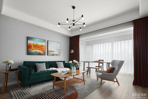 本案的灵感来源—在哈萨克斯坦卡因德湖中,有很多倒长的云杉树,他们的树干伸出水面,枝叶却长在湖泊里,形成了非常奇特的自然景观。 精致的细节—客厅的艺术吊灯,经典的磨砂黑搭配现代古铜色的金属质感搭配绒布的主沙发有效提升了整体空间的优雅格调。 精致的细节—客厅角落的艺术铁艺落地灯,不仅材质和颜色与客厅主吊灯呼应而且可以满足不同姿势,不同场景的使用需求。 餐厅—实木餐桌上配以水培龟背竹与墙面挂画植物相一致