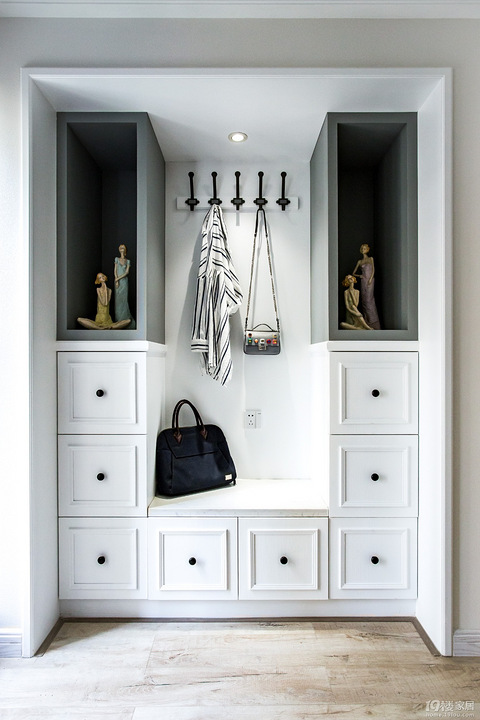 让空间视觉的最大化…光线的最大化,早晨东面的玄关、午间卡座式的餐厅、下午伴着落日的书房,都在光照纱帘的氛围中更具度假感…开放式的各个空间设计,更像是业主为朋友们增添多了一个假日休闲聊天的好去处…软硬装设计走简约的宜家味:面包砖、六角砖、原木地板、IKEA家具... 玄关背景采用收纳和装饰结合,摒弃以往单一的背景,鞋柜与整体环境相融合。贴心的设计了换鞋座椅,储物收纳柜,以及放包的挂钩。 整体空间灰白