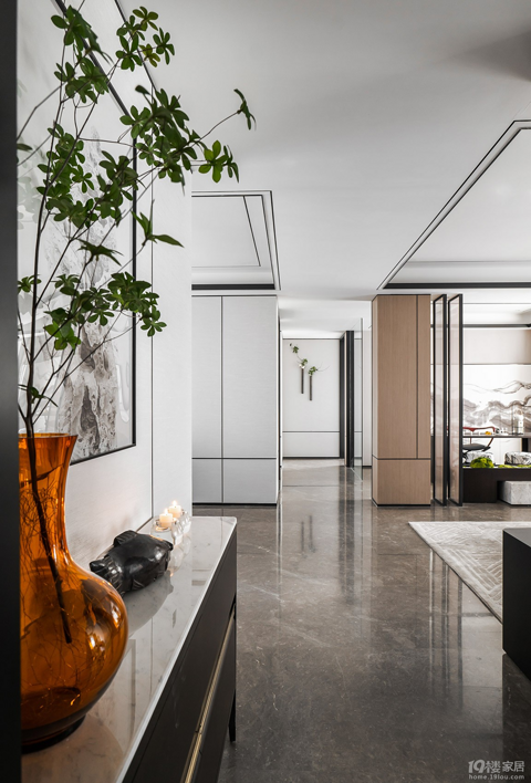 每个中国人都有一个园林梦,园林是国人对于私宅的终极梦想。本案是坐落于临安于先生家,顶层自带超大露台,远山近水尽收眼底。 不管今天大家对顶级豪宅的印象是什么,一百多年前大家比的可是园子。本案运用中式园林的设计手法,带来不一样的居家生活体验。现代的材质和简洁的手法,无不传递着东方的韵律与品性。餐厅背景墙的留白和哑光的质感与大理石桌面和手工玻璃花瓶相辅相成,融为宁静,淡雅,通透的空间。 茶室以屏风为背景