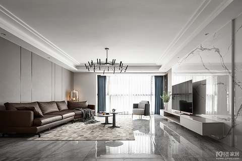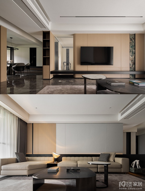 室内以简练、优雅、舒适为设计核心,通过材质、色彩、线条等元素,构建清爽、舒适的生活空间。 公共区域地面通铺大理石纹砖,天花以周边吊顶形式将空调与筒灯藏于其内,立面则以暖灰色皮质硬包与浅色大理石纹砖作为材质及颜色之间的碰撞,凸显空间开阔、大气之感。 电视背景墙以大理石纹砖依次叠加并重组线条感为设计亮点。纹路自然延展、右侧恰好形成梯度线条,与定制的条形电视柜组合成立体的空间。 客厅选用造型独特且实用的